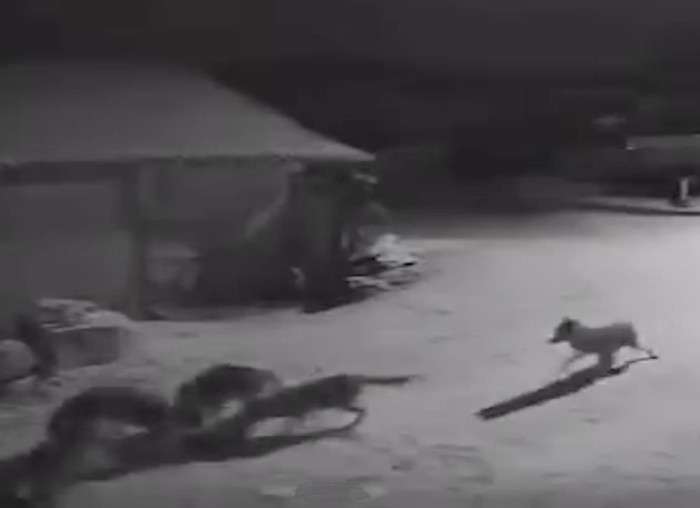 Güvenlik kamerasına yansıyan görüntülerde kurtların köye indikleri ve bir köpeği kovaladıkları görülüyor.