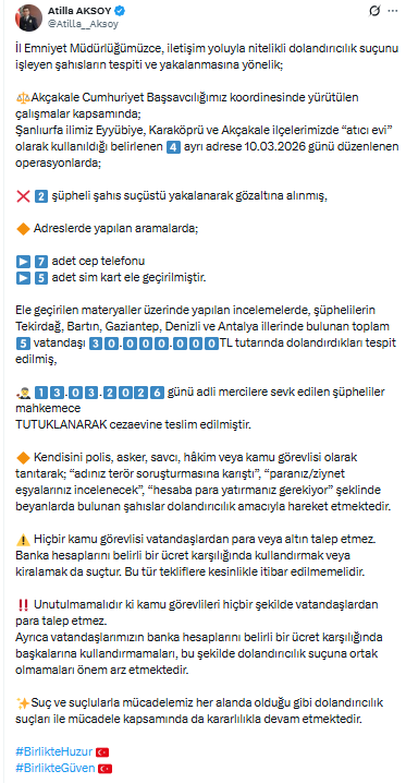 Şanlıurfa İl Emniyet Müdürlüğü, dolandırıcılık suçlarına karşı yürütülen çalışmaların kararlılıkla devam edeceğini bildirdi.