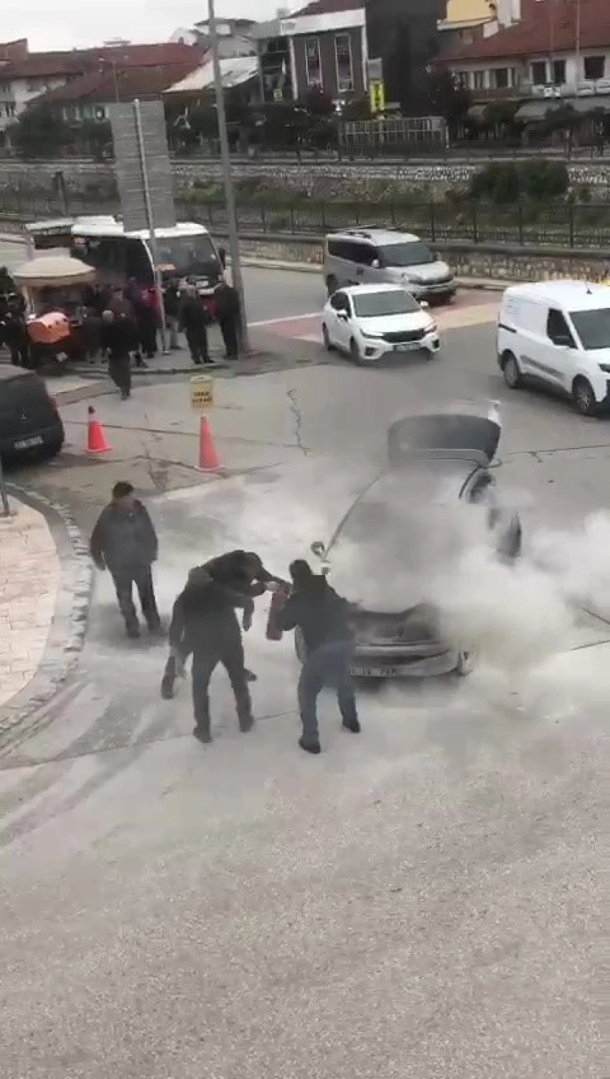 Düzce'de motor kısmından alev alan otomobile çevredeki esnaf yangın tüpü ile müdahale etti.